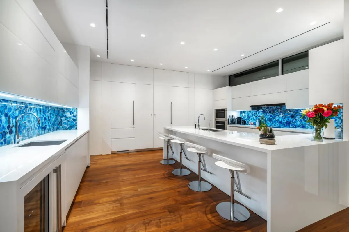 Luxury materials — marble, quartz, and natural stone surfaces.