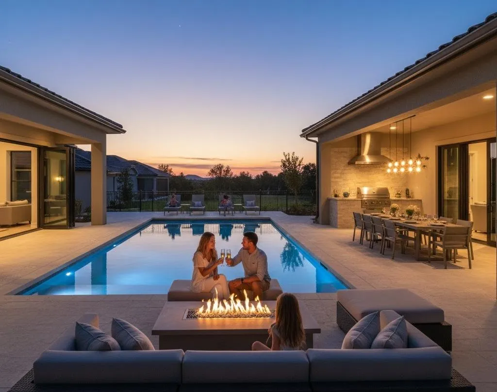 Fire pits, outdoor kitchens, and mood lighting integration.